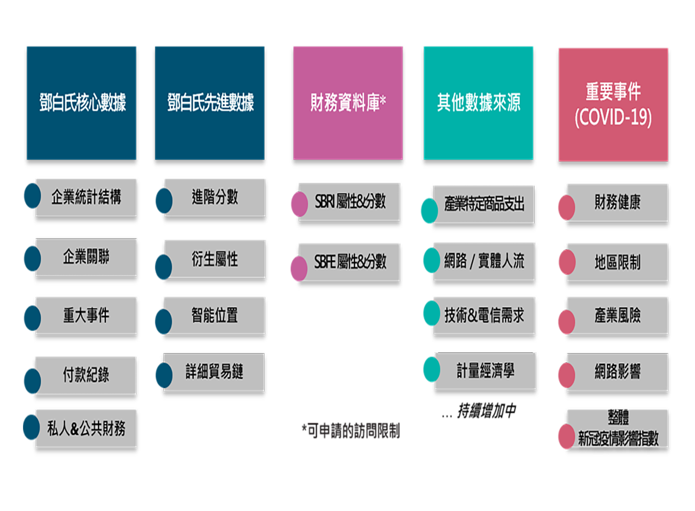 您可以將「自身的數據、鄧白氏數據雲的數據、陸續增加的其他數據來源」合併,