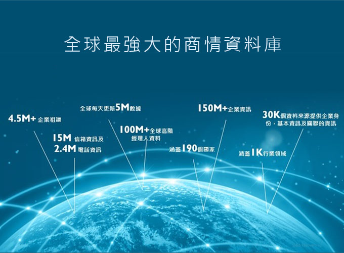 D&B Hoovers 全球商業資料庫擁有包括 1000 多個產業分類和超過 3 萬個資料來源,囊括 1.7 億以上的公司資訊,幫助團隊更快建立商機,縮短市場與業務開發周期!