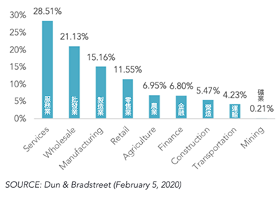 鄧白氏最新發布的報告《新型冠狀病毒帶來的商業衝擊》(Business Impact of the Coronavirus)指出(資料蒐集截至2020年2月5日止),首當其衝的五大產業為製造業、批發貿易、零售、金融與服務業。中國境內的活躍企業,有九成以上位於此次衝擊情況最嚴重的幾個省份,更有五萬家外商在這些區域皆設有子公司和分支機構;光是北京、廣東、江蘇、浙江和山東,就佔了中國總就業人口的50%,並佔去中國經濟銷售總額的 48%。而全球有5萬多家企業的一級供應商,以及超過500萬家公司的二級供應商,都位於中國疫區。。