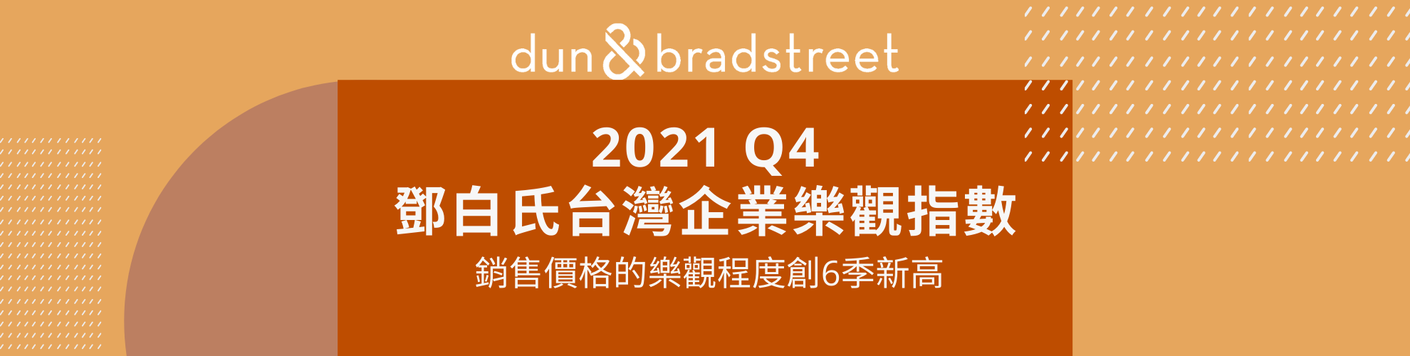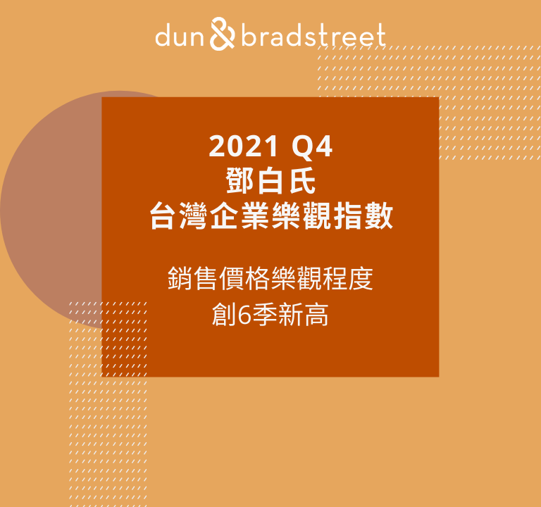 美商鄧白氏發布 2021 年第四季的「台灣企業樂觀指數」報告,此調查目的在衡量商業社群的脈動。該指數顯示,2021 年第四季的企業樂觀指數較上一季有所增加,調查中的 6 個參數,銷售量、新增訂單量、浄利潤、備貨水準、雇用員工數等的樂觀程度都有所增加。
