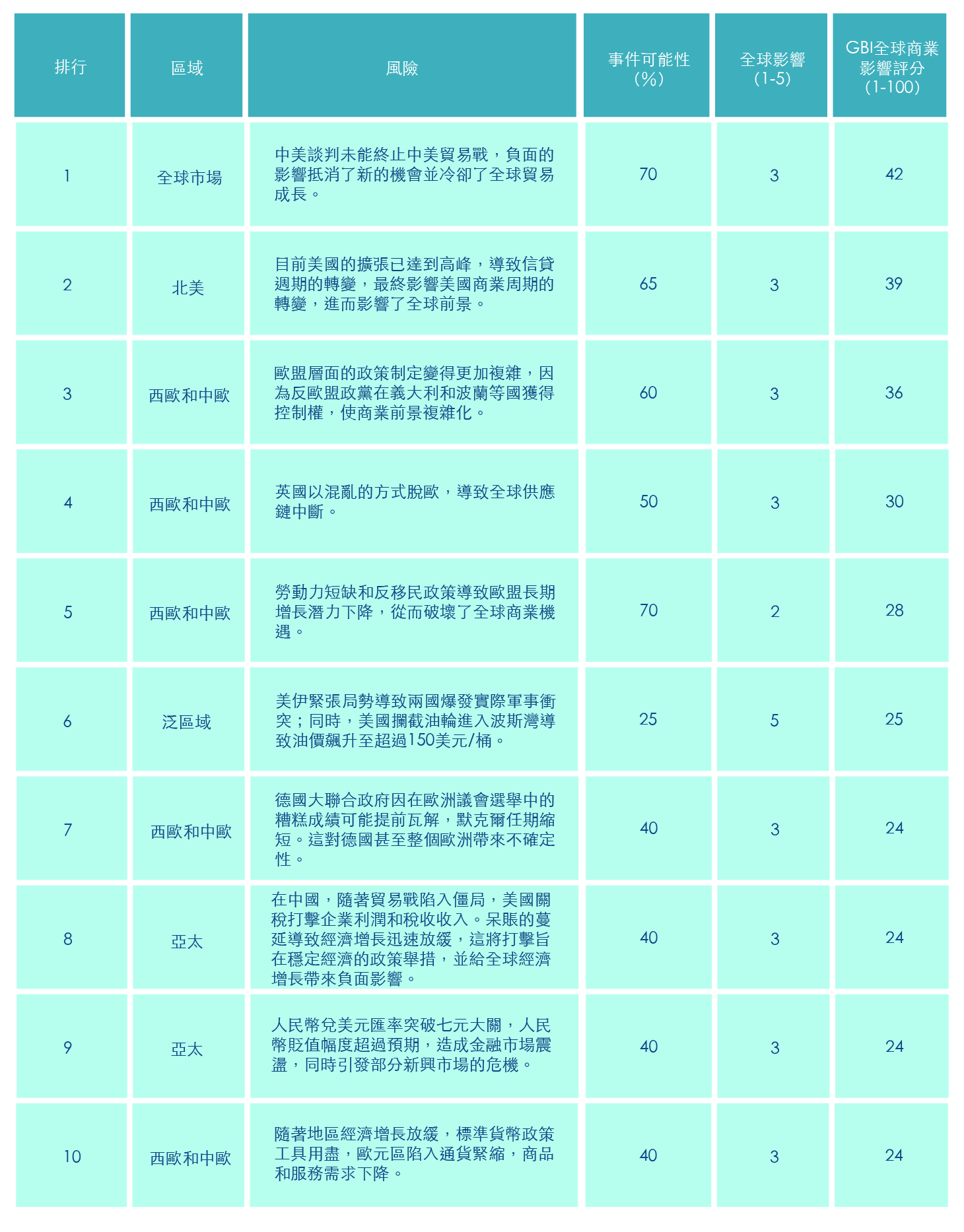 2019第三季度《全球商業風險報告》列出的全球十大風險因素中,出現了三項新風險:其中兩項來自西歐和中歐,一項來自亞太地區,這亦凸顯出全球環境不斷變化的態勢。