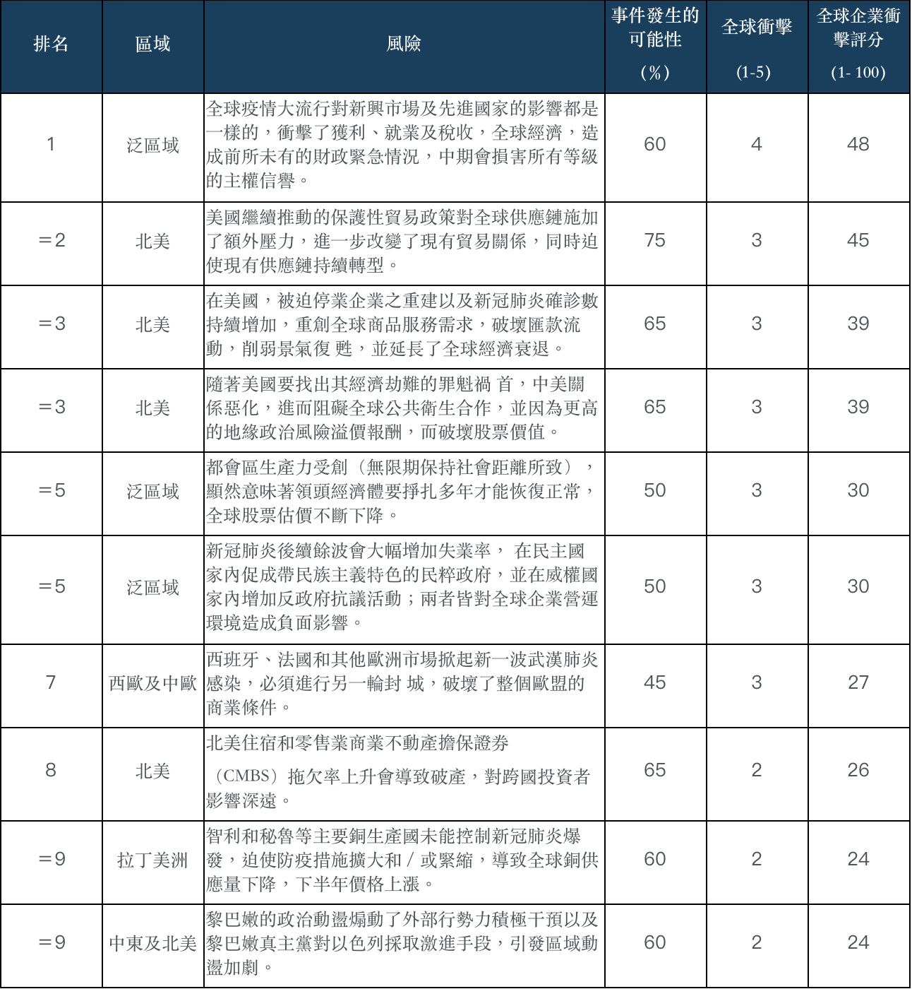 第三季的前十名整體上凸顯了新冠肺炎全球大流行的性質,與之相關的三大風險是跨區域的,兩大風險來自北美,西歐中歐和拉丁美洲各有一個風險。在三項非新冠肺炎風險中,兩項來自於北美,一項來自於中東與北非。