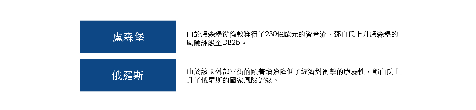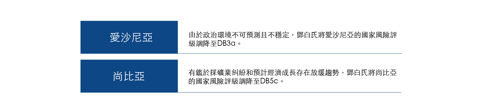 全球市場風險評級變更,歸納了2019年6月的風險變化。本月全球有2個市場風險評級上升,有2個市場風險評級調降,以及3個全球市場的評級未來發展趨勢調整。