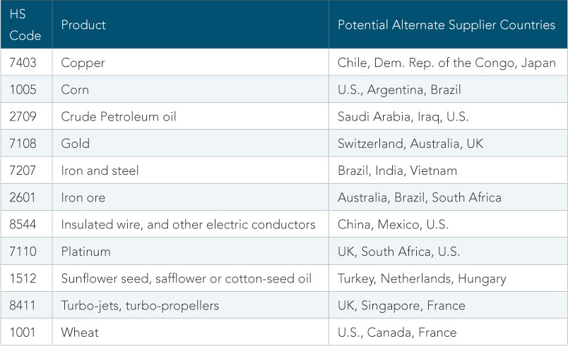 研究特別表明,歐洲的儲氣量非常低,僅為容量的 33%。由於目前歐盟對俄羅斯實施制裁,德國暫停了北溪 2 號天然氣管道,預計 2022 年將有 300 億立方天然氣進入歐洲大陸。鄧白氏數據顯示,這些問題與其他地緣政治緊張局勢和供應短缺將在短期內造成高油價。而這僅是將受到全球供應鏈制裁壓力的一部分。俄羅斯主要出口的大宗產品的深入研究如下: