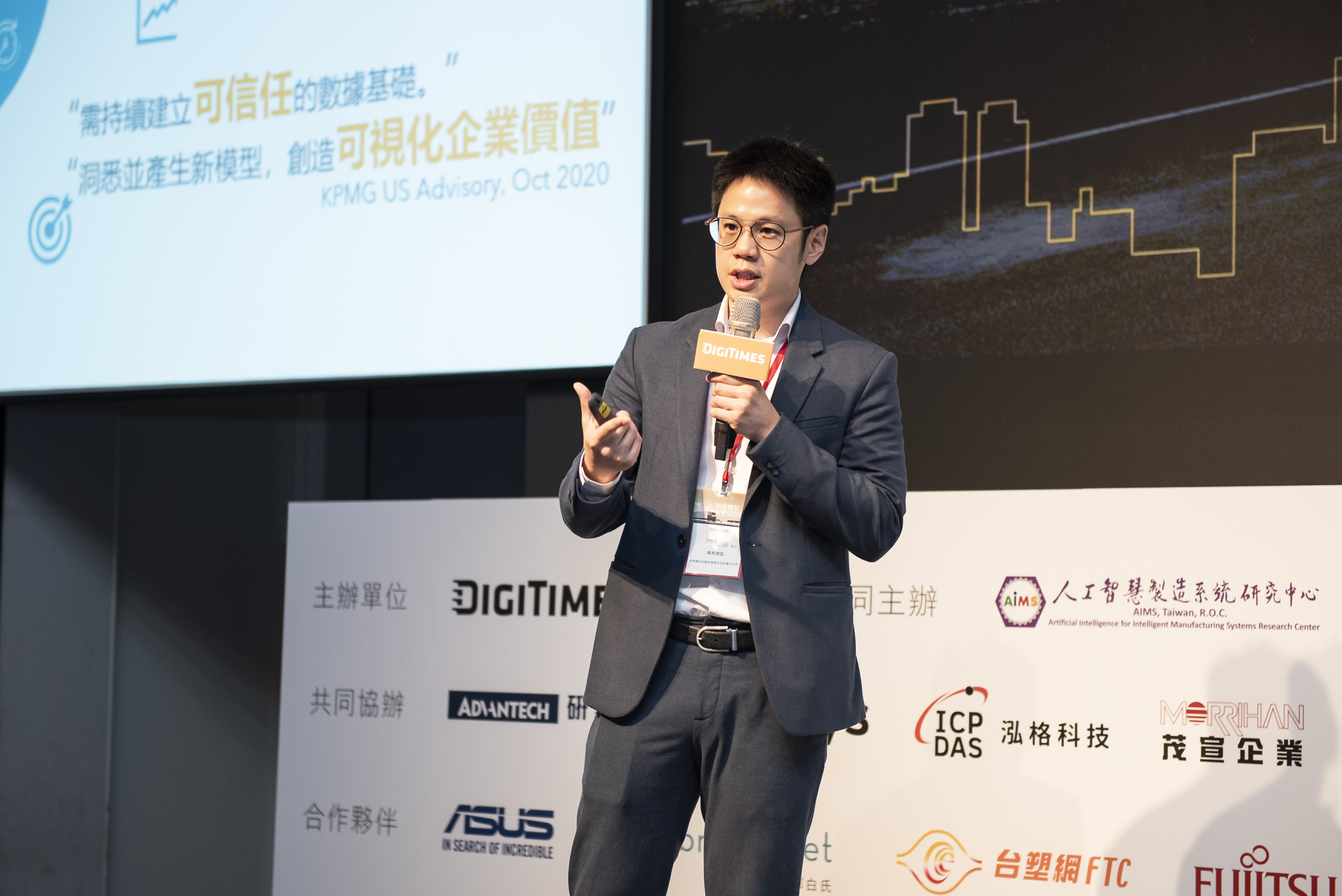 演講中他首先提到企業數據需持續建立可信任的數據基礎,並透過與外部數據的結合洞悉、產生模型,創造可視化的企業價值。